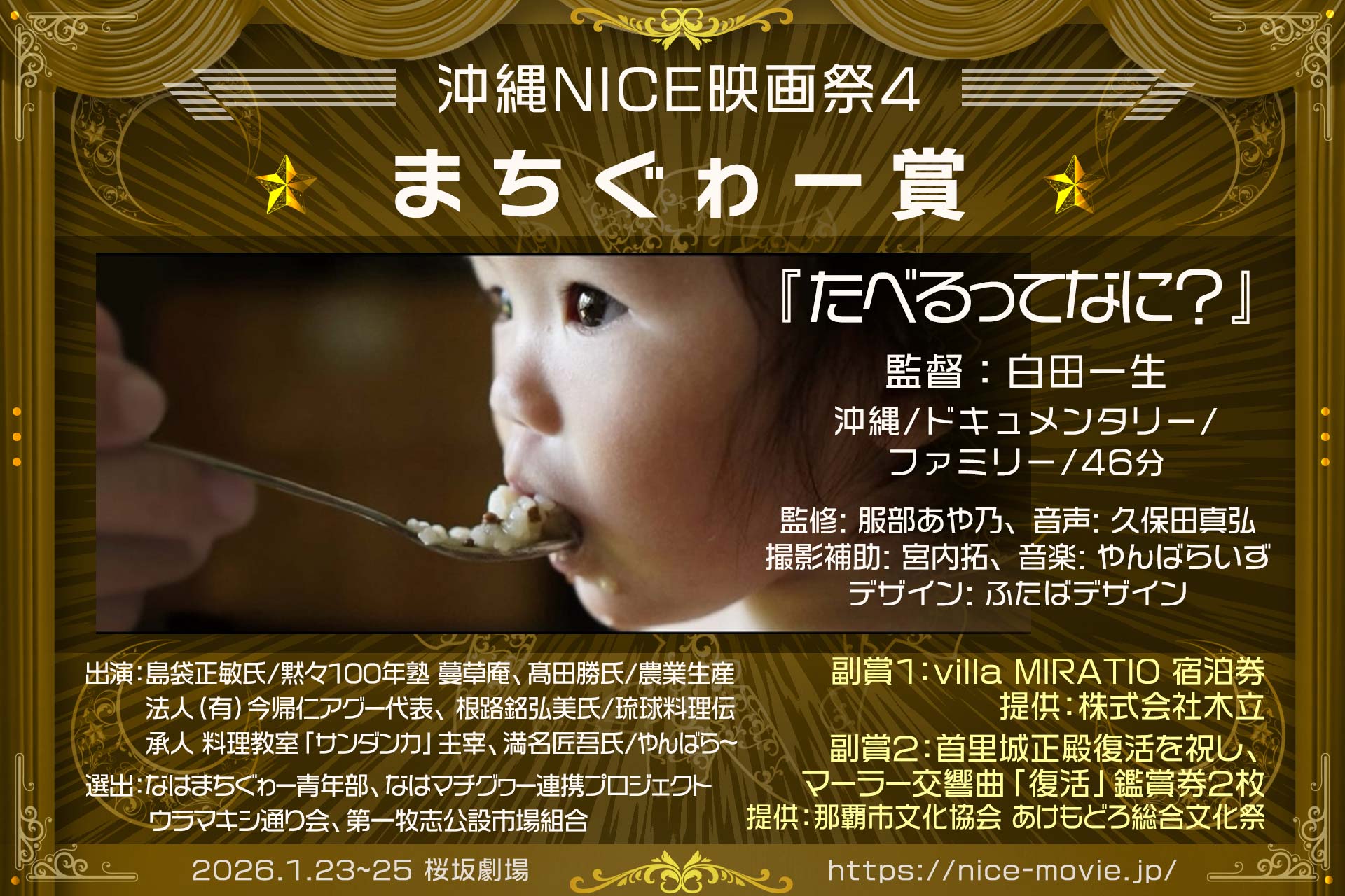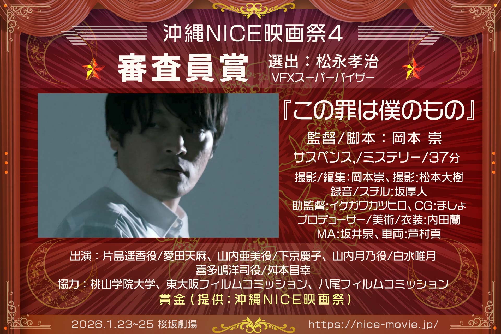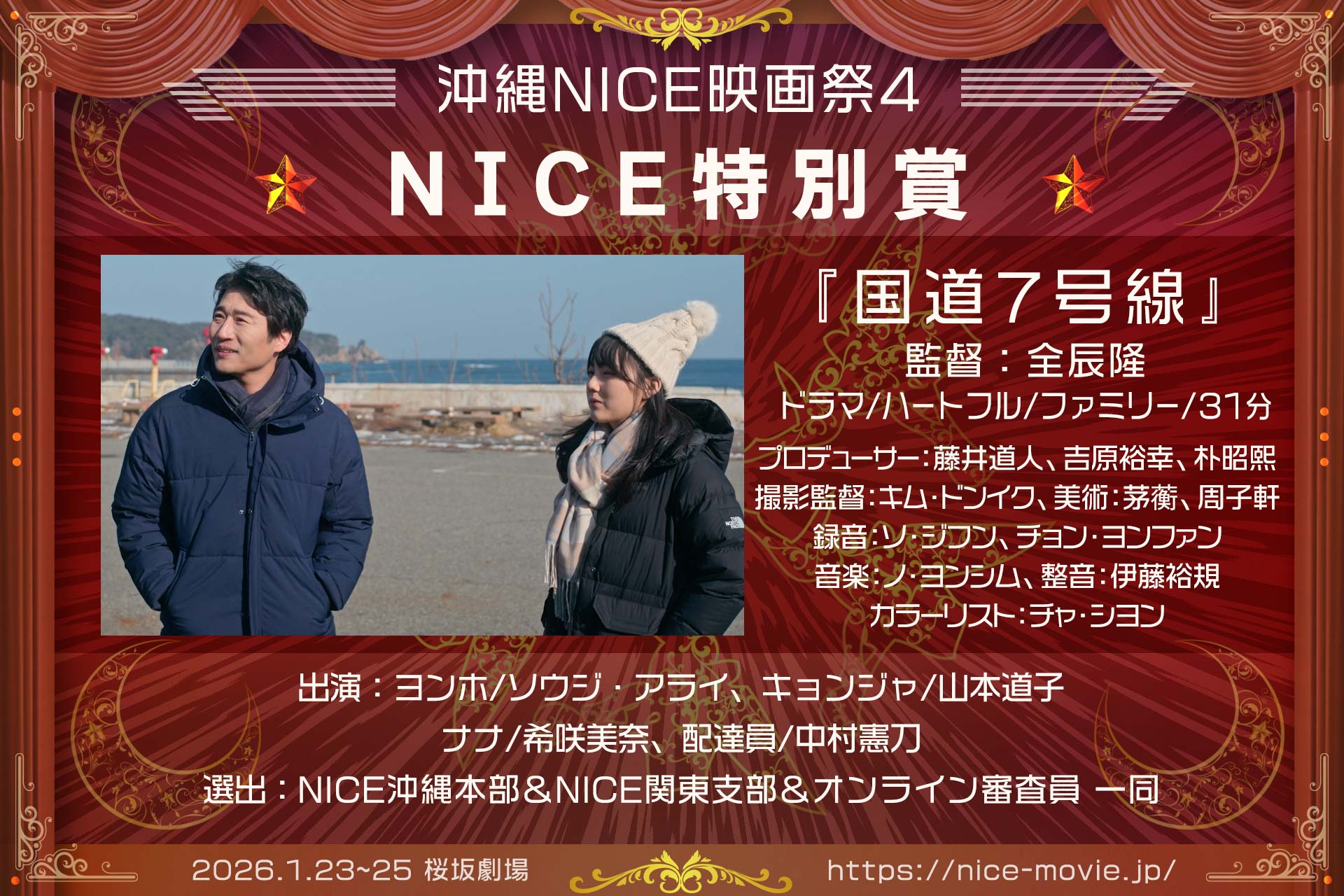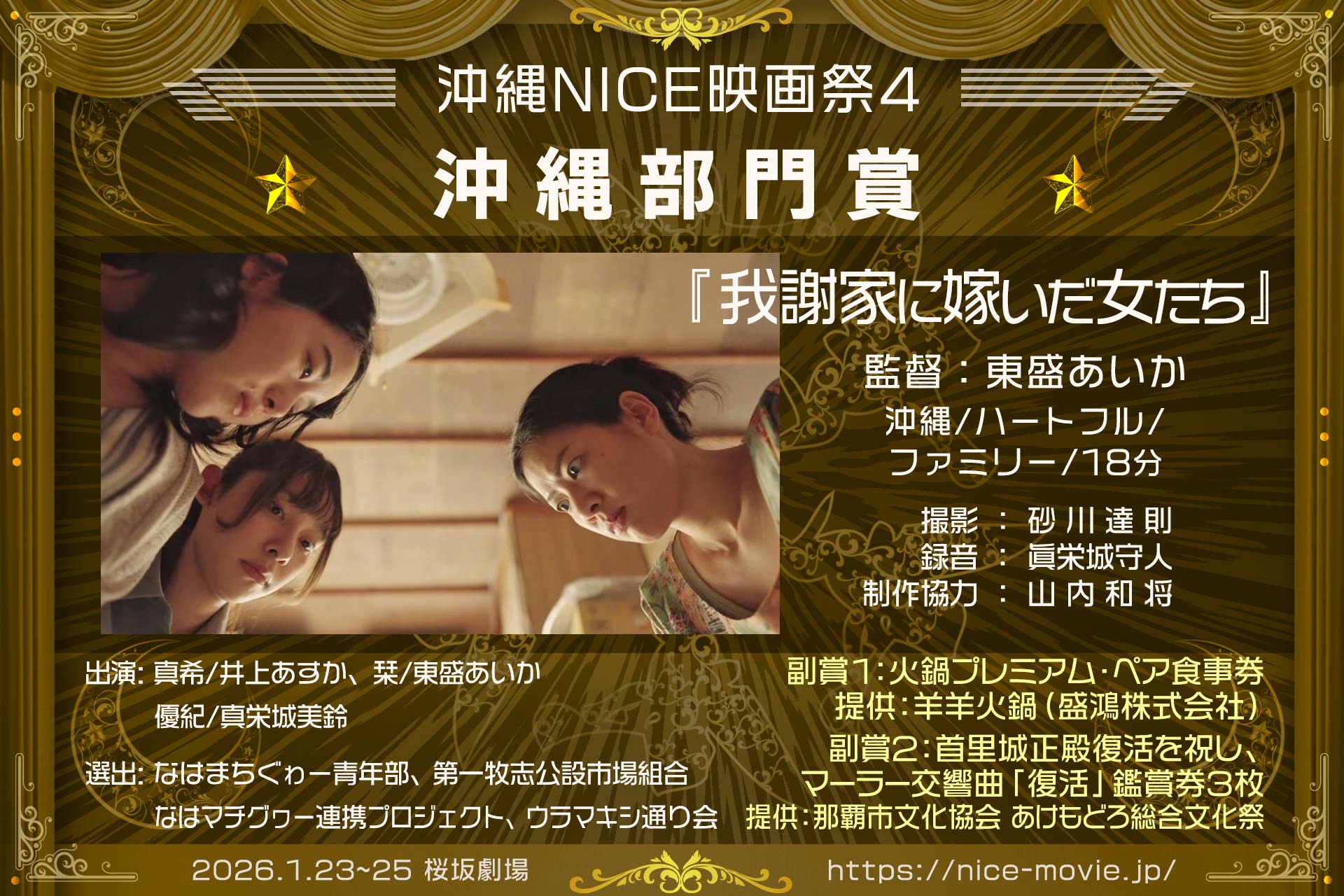 2026年1月25日、桜坂劇場ホールCにて開催の「沖縄NICE映画祭4」表彰式の結果をお知らせします。受賞された皆様、そしてご来場・ご参加いただいた全ての皆様に、心より感謝を申し上げます。