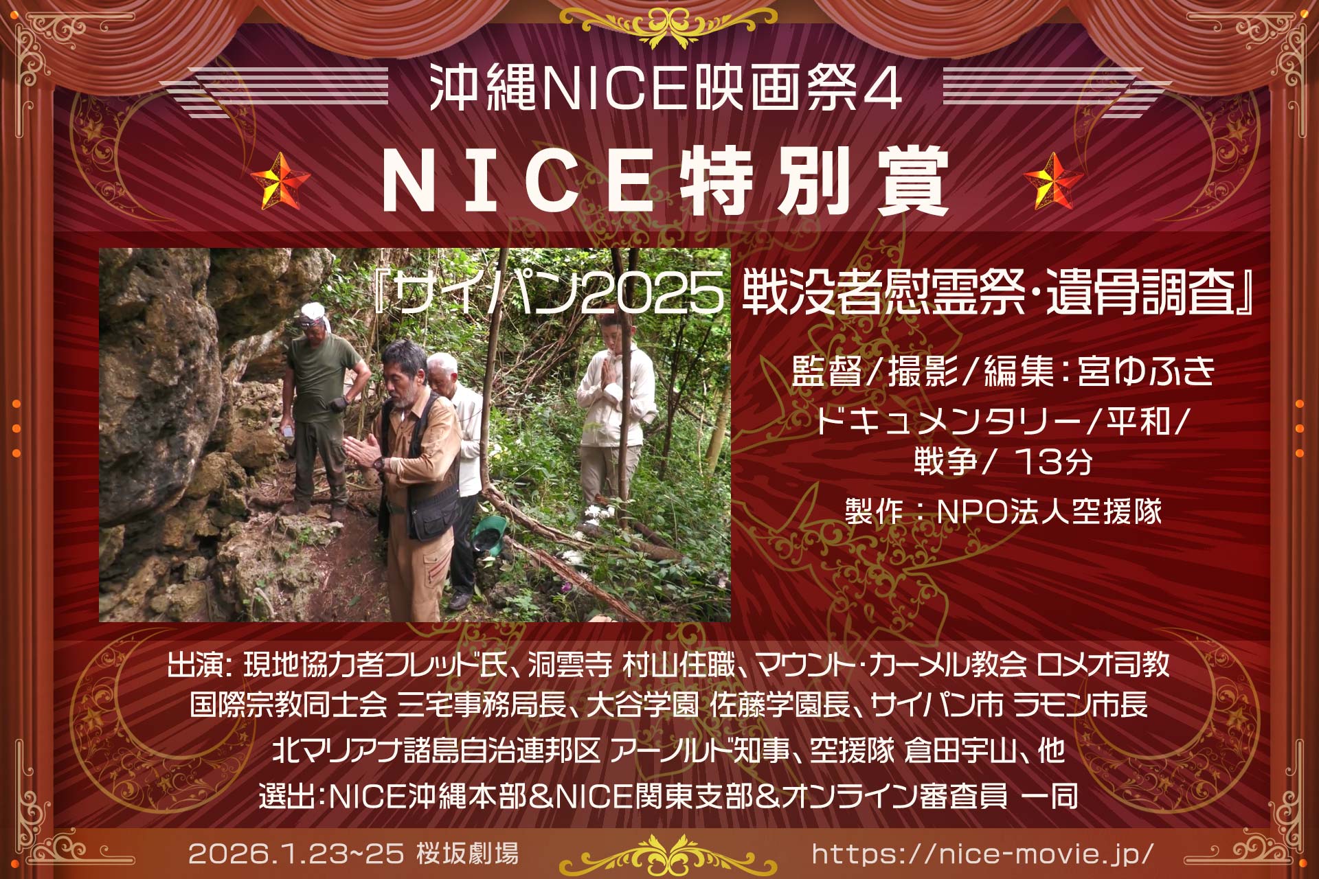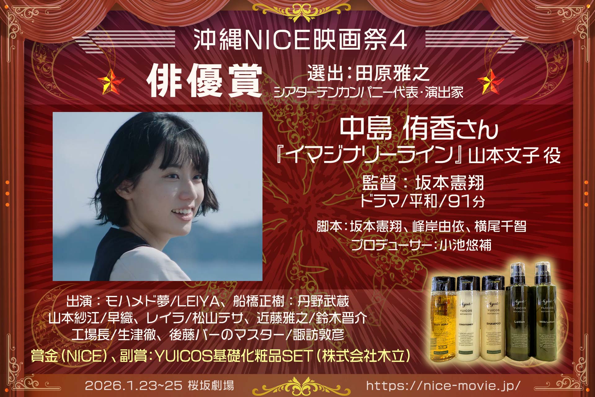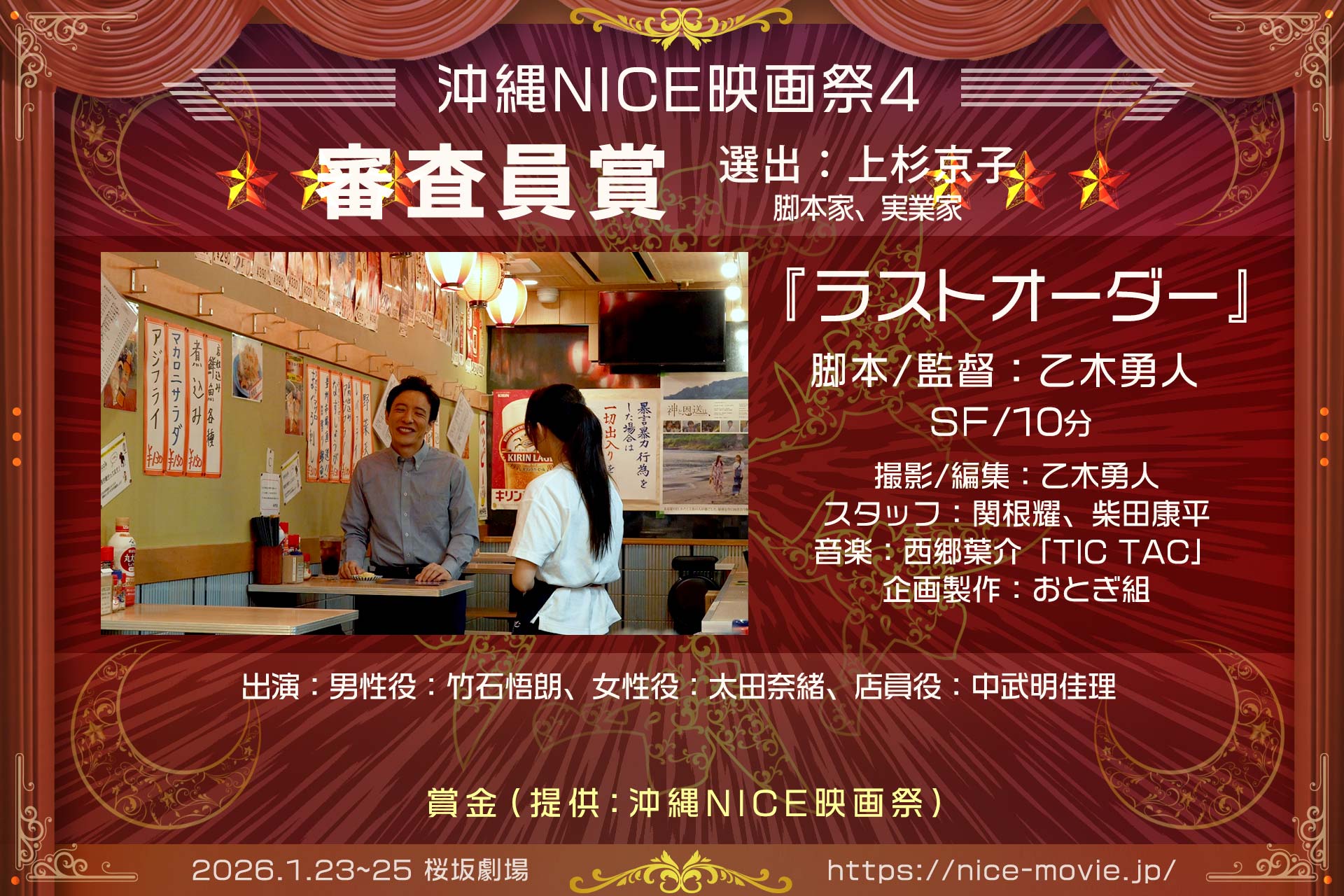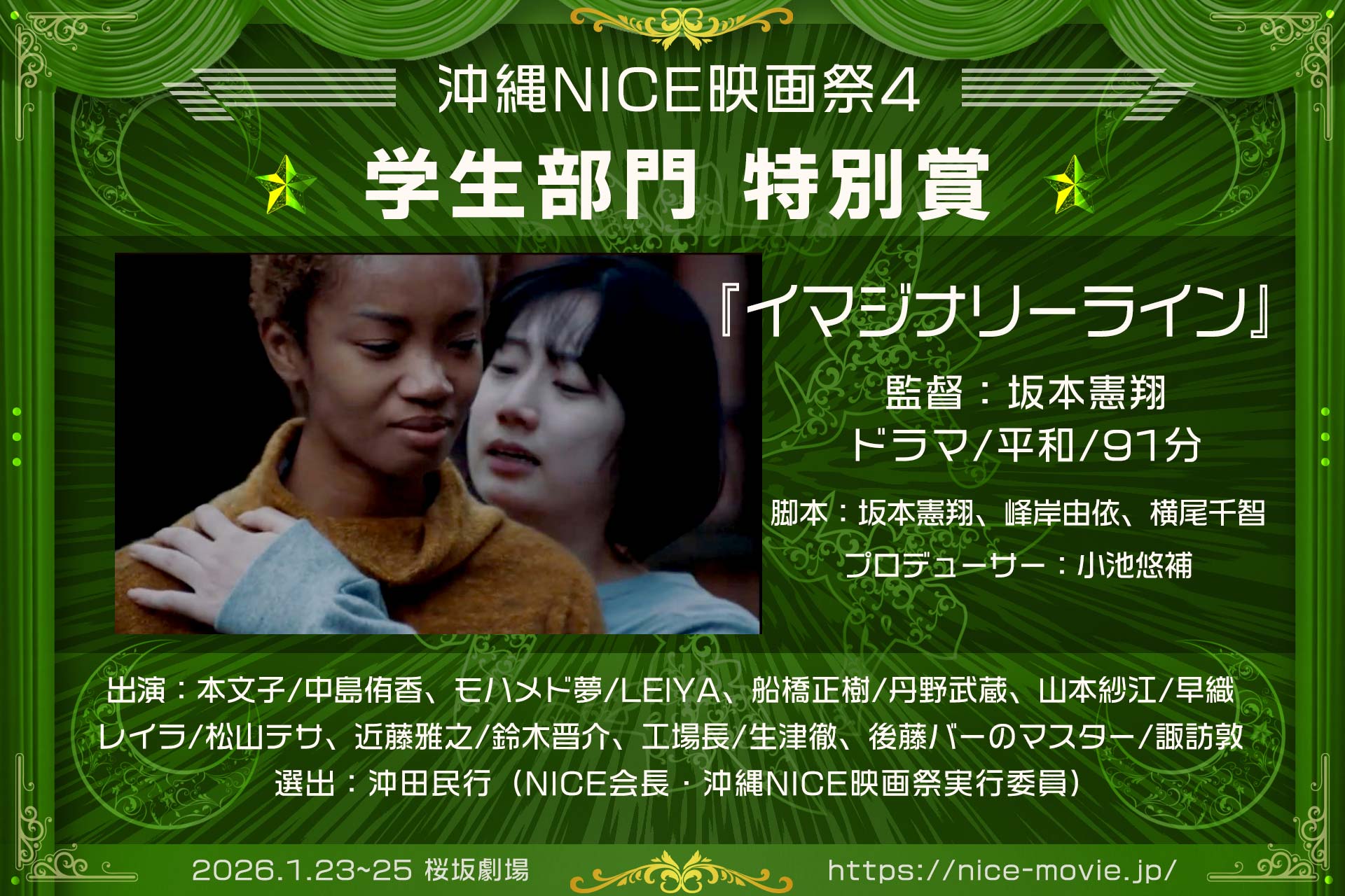2026年1月25日、桜坂劇場ホールCにて開催の「沖縄NICE映画祭4」表彰式の結果をお知らせします。受賞された皆様、そしてご来場・ご参加いただいた全ての皆様に、心より感謝を申し上げます。