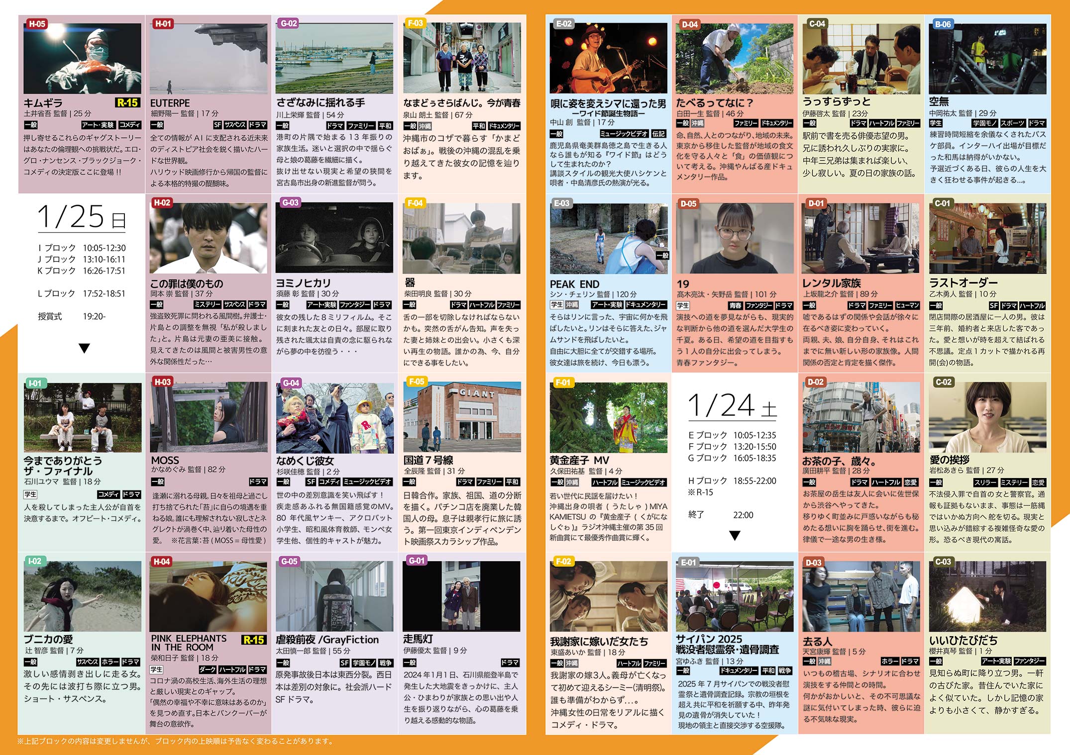 | B5 | 15:17 | 短編4分/学生部門 『対岸の声』 監督:城間愛空 ジャンル:学園モノ, ドラマ, ホラー, ミュージックビデオ |